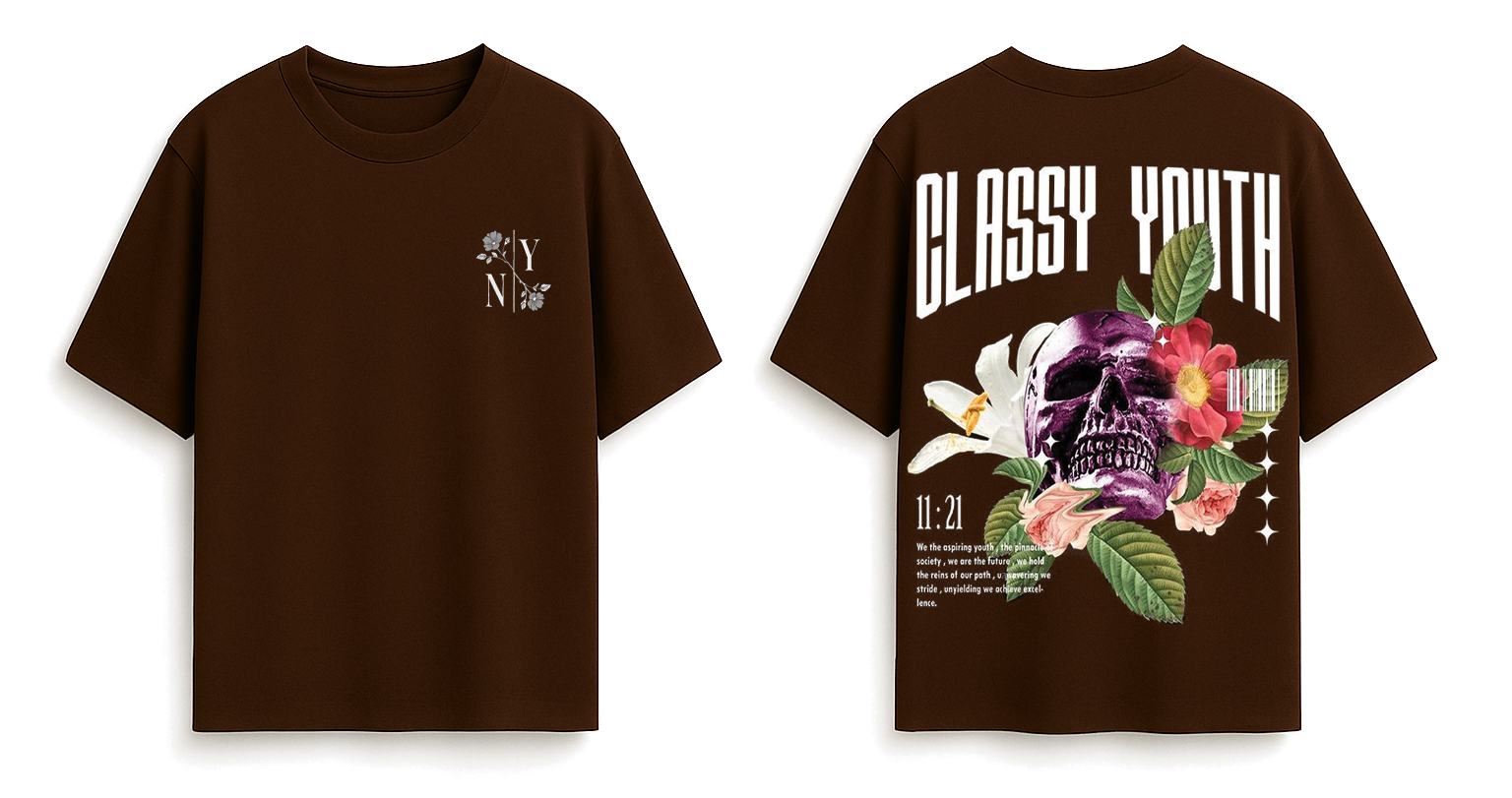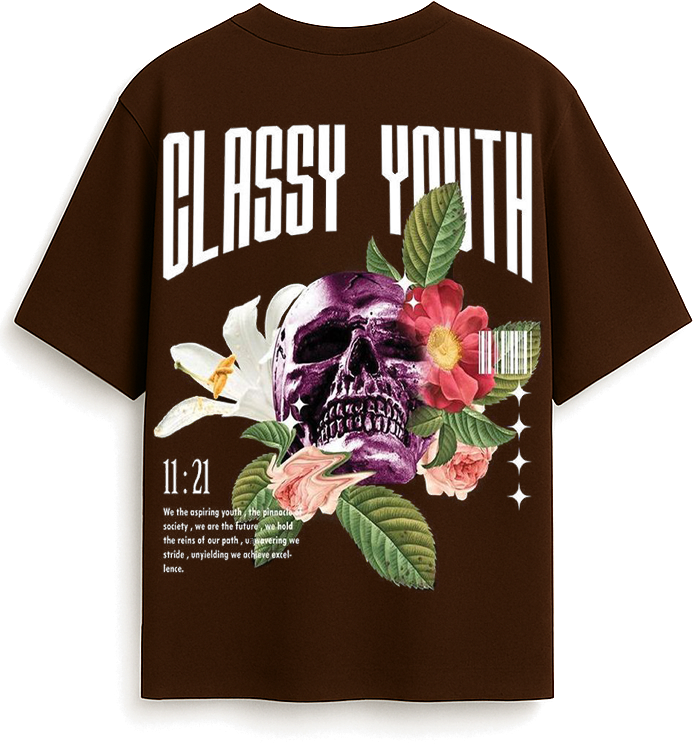 A bold brown tee with “CLASSY YOUTH” text, featuring a vibrant skull and floral graphic that blends edgy and artistic vibes.